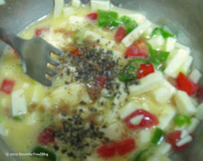 Then we add salt, pepper, a dash of anything else you might like (sometimes I add a bit of Worcester sauce, because you haven't cooked till you've killed your tastebuds with hotness). We beat it once, then add a tablespoon of flour, fold it in, the add three tablespoons of milk. And beat till frothy. In the absence of a beater, a fork will suffice.